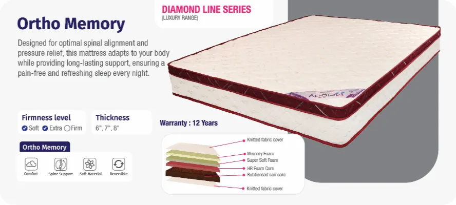 The Ortho Memory Mattress from Melody Mattresses belongs to the Diamond Line Series (Luxury Range). It is designed for people who want advanced orthopedic support, plush comfort, and durability. Built with memory foam and high‑resilience materials, this LUXURY RANGE mattress adapts to your body while providing long‑lasting support. It ensures healthy pain‑free sleep and refreshing rest every night. If you are searching for an extra soft mattress that also delivers firmness and balance, the Ortho Memory Mattress is the perfect choice.