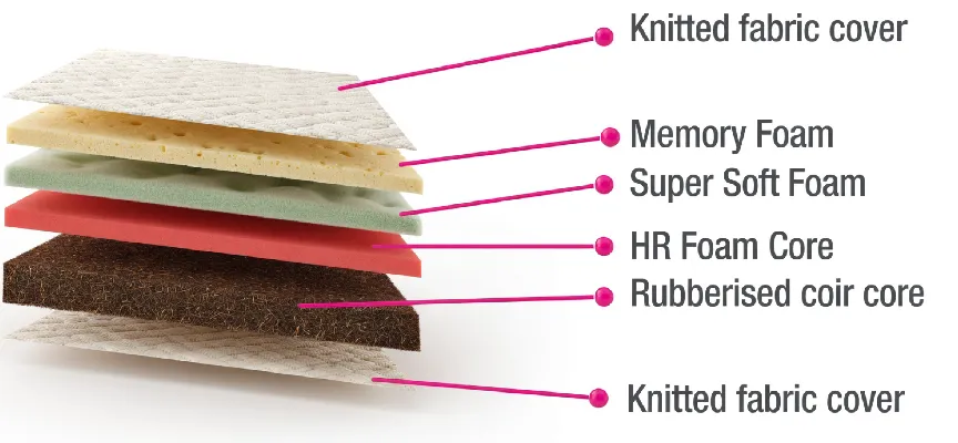 The Ortho Memory Mattress is designed to cradle your body while keeping your spine aligned. The memory foam layer adapts to your body shape, while the HR foam and coir core provide firmness. This balance helps reduce body strain, improve posture, and ensure deep, restorative sleep. It’s a mattress that adapts to your body while providing long‑lasting support.